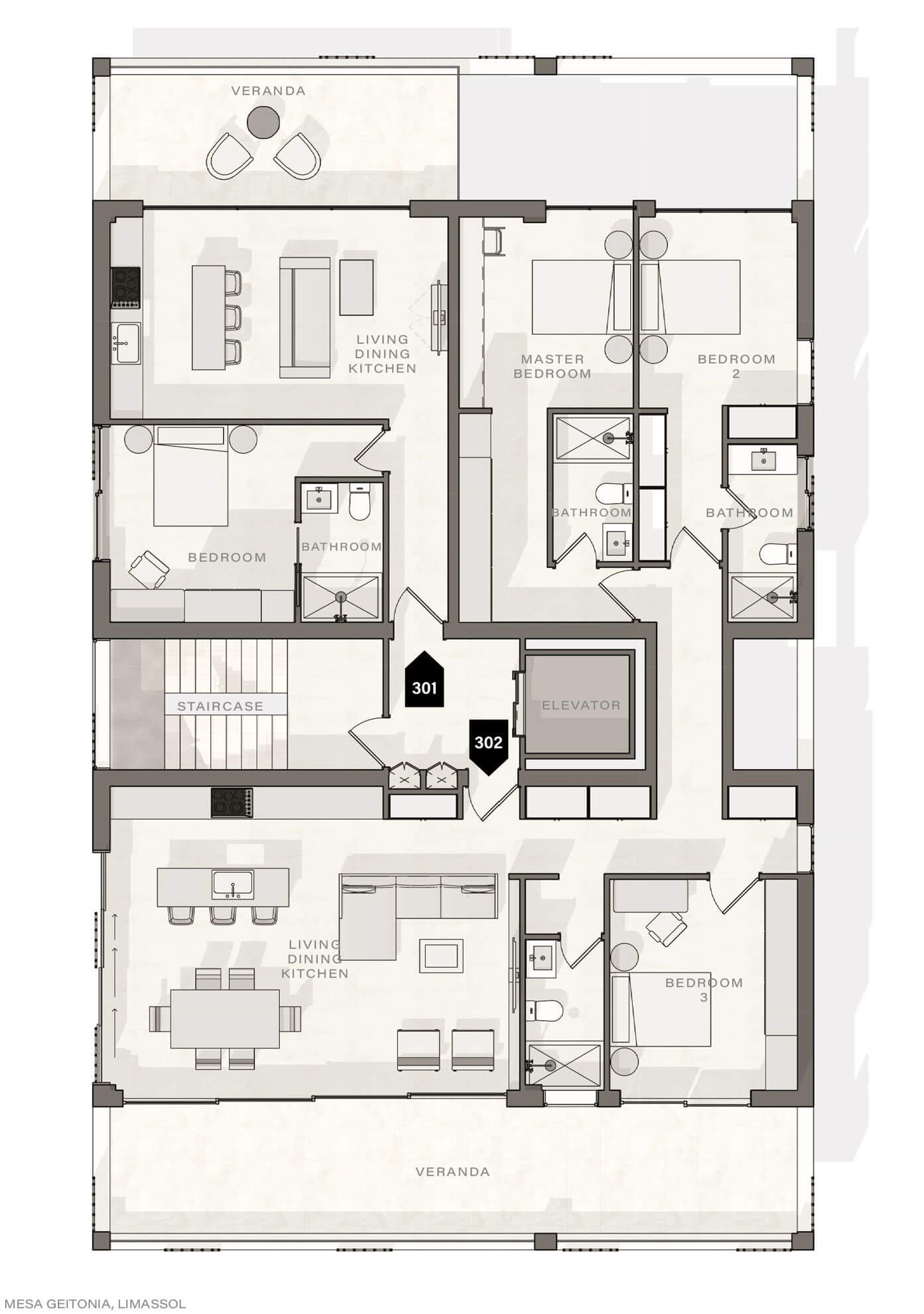 Three bedroom three bathroom,139 sqm ,21 verandas +100sqm roof garden, one parking places. . Price €600,000+vat